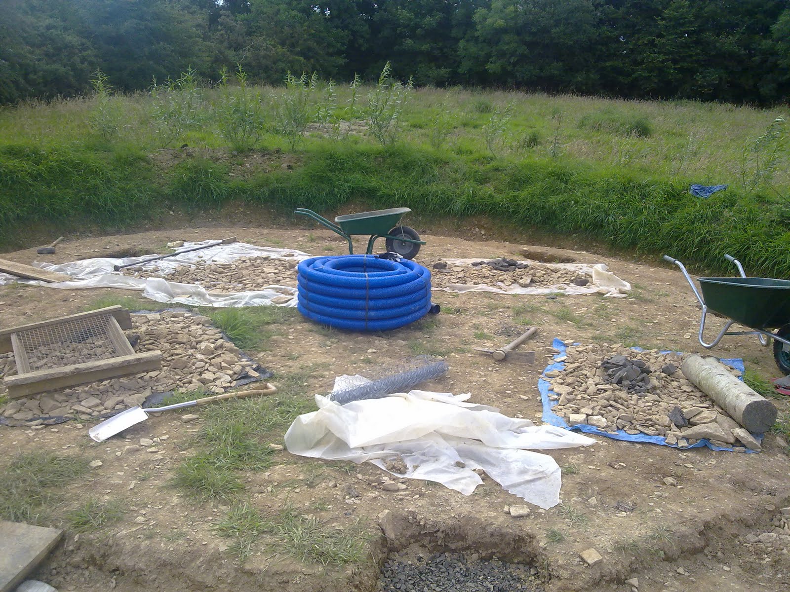 After lunch work resumed however Emma stripped the bark off one of the supports, I tamped slate into the footing for foundation, whilst Dan and Bree worked some more on the drainage ditch. Ayres busied himself with various tasks but wasn't at 100% on account of suffering from man flu.